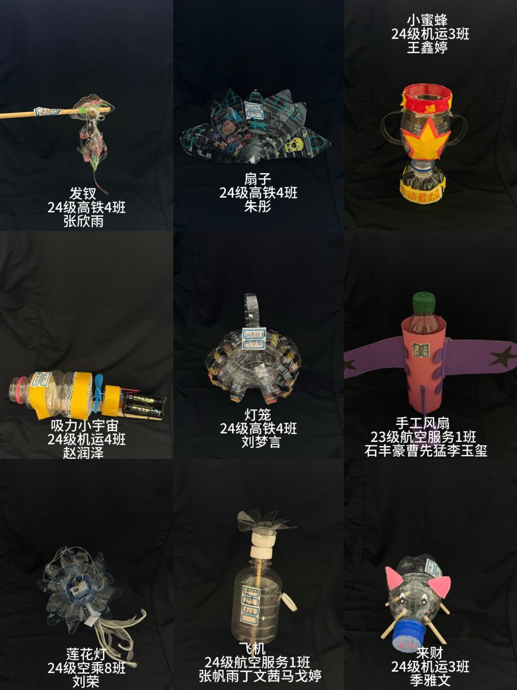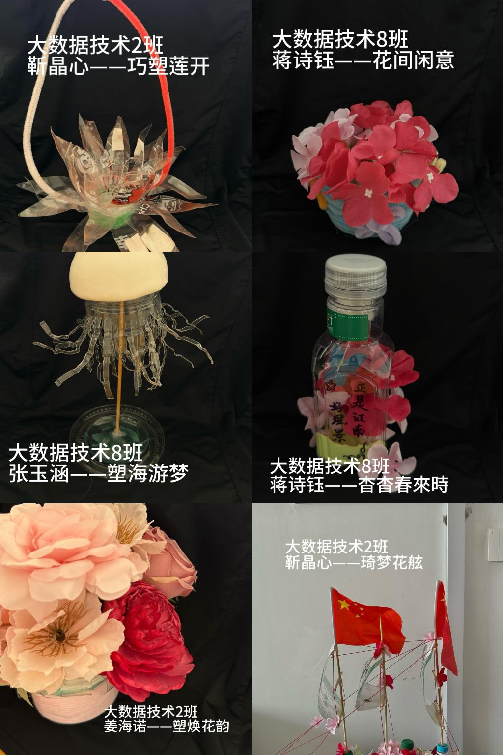 信息工程学院更是别出心裁,依托专业特长,巧妙构思,将纸箱、塑料等常见废品化作精美的大帆船,与翱翔天虹的鸟儿,还有绚烂的塑料花艺术装置等;