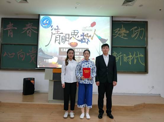 精彩的比赛过后,进入颁奖环节。本次比赛共产生一等奖一项,二等奖两项,三等奖三项。节目《乳娘》荣获一等奖,节目《青春的誓言》《祖国至上》荣获二等奖,节目《满江红》《见字如面忆英雄先烈》《忆先烈》荣获三等奖。