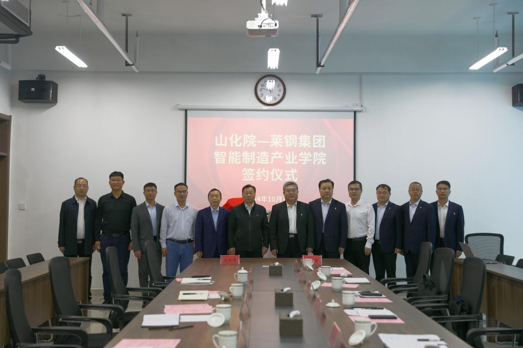 10月15日上午,山化院-莱钢集团智能制造产业学院签约揭牌仪式在我校圆满举行。莱钢集团党委副书记、董事、工会主席李茂岭,莱钢党校副校长、培训中心党委书记、主任鉴继祥,我校校长贺志强出席仪式。仪式由学校常务副校长冯喜成主持。