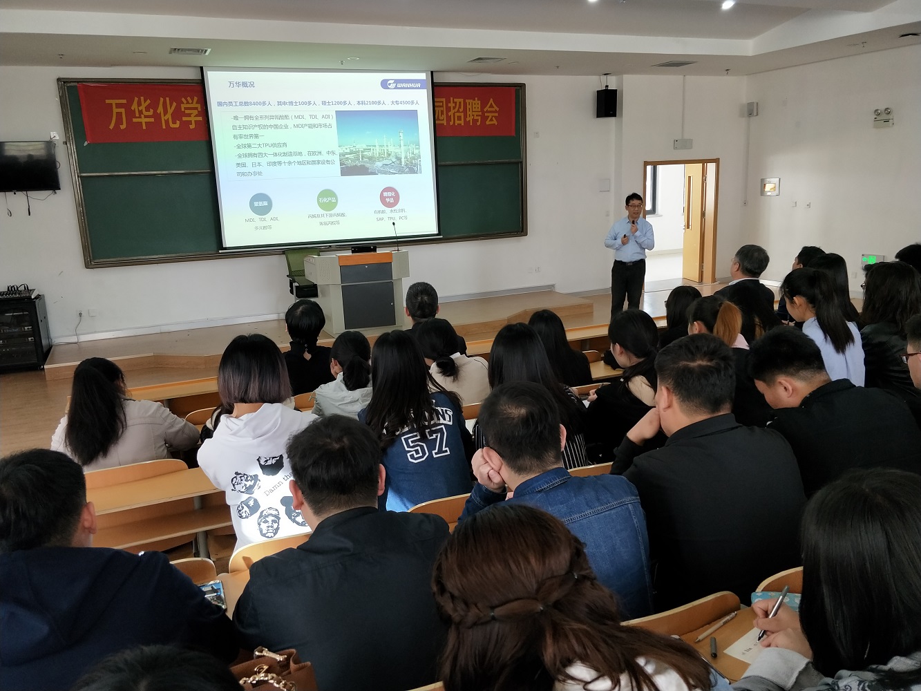 招聘宣讲会上,万华化学人力资源招聘经理介绍了公司的发展历史、企业文化、员工的工资和福利待遇、工作岗位、培养成长体系等情况。对于学生关注的个人培训成长体系,万华化学招聘经理作了特别介绍,万华化学始终将人才作为公司的第一核心战略资源来培养,实行有万华特色的“双导师制”,为每位员工提供职业与专业双导师。职业导师与员工没有业务关系,帮助员工进行职业规划;专业导师是同岗位上的前辈,帮助员工尽快熟悉工作。万华还为员工提供通用课程、岗位技能课程和管理与领导力课程,方便员工在工作之余进行“自我充电”,完善职业技能,不断发掘自身潜能。此外,定期的“高管咖啡时间”活动为普通员工和企业高管提供面对面的交流机会,高管了解员工工作和学习上的需求,并据此进一步完善人才发展机制。到场的学生被万华的发展理念、人才机制、薪资待遇、工作环境等深深吸引,表现出极大的兴趣。万华化学人力资源总监赵继德还与学生进行了现场交流,回答了学生们关注的几个问题,欢迎山东化工职业学院学子加入万华化学,实现企业和个人的共同发展。宣讲结束后,万华化学对学生以笔试的形式进行了专业素养和心理测试。