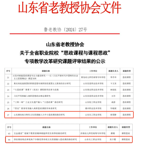近日,山东省老教授协会公布了全省职业院校“思政课程与课程思政”专项教学改革研究课题立项名单,我校马克思主义学院吴宁霞主持的《供给侧改革视角下齐鲁优秀传统文化资源融入思政课的路径研究》和侯雪静主持的《山东潍坊地方特色文化资源融入大中小思政课的路径研究》两项课题在竞争中脱颖而出,成功获批立项。
