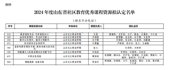 近日,山东省教育厅对2024年度山东省社区教育优秀课程资源遴选结果予以公示,我校8门课程入选,分别是《维护国家安全 守护爱国初心》《涵养家国情怀,争当时代新人》《提升公民意识,倡导文明新风》《织密国家安全防护网》《直播电商客服快车道:高效沟通与成交技巧》《四旋翼无人机组装调试及实操飞行》《日常应急急救》《拥抱健康 远离疾病》。