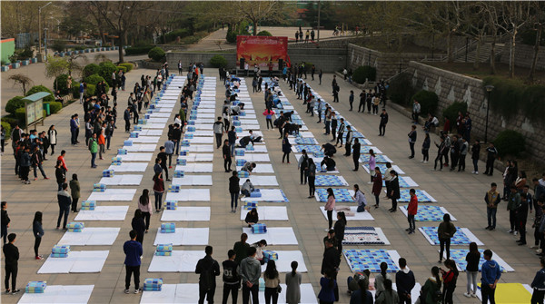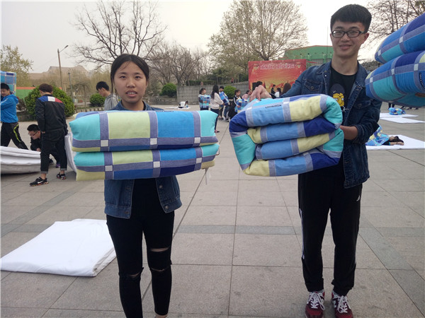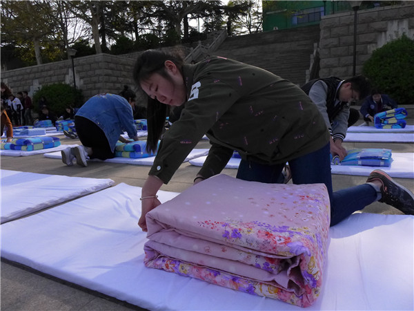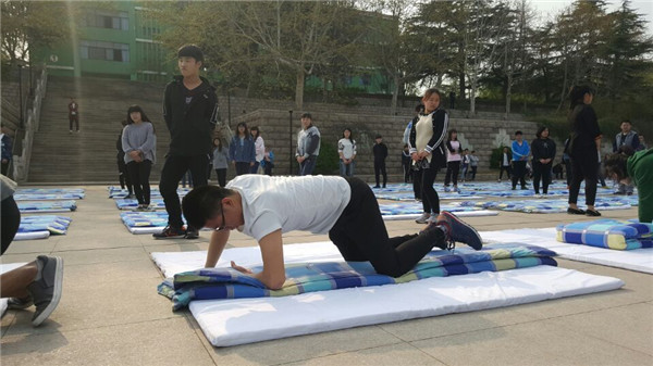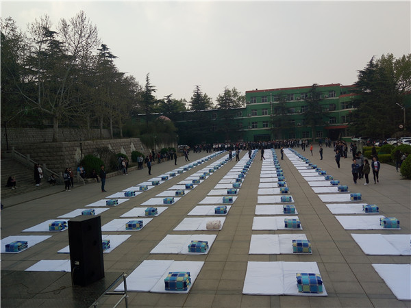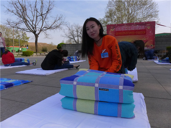 4月12日,山东化工职业学院大学生叠被子接力赛在校园小广场举行,来自全校的125名同学组成25支代表队参加了比赛。他们5个人一组,每人负责叠一床被子,每组的第一名同学叠完之后,下一名才能动手叠,以此接力,直到第五名同学在25分钟之内叠完。25分钟之后,由同学们自己组成的裁判小组,根据每床被子叠成的“豆腐方块”程度进行现场考评打分,最终评出优胜队和30名优秀个人。