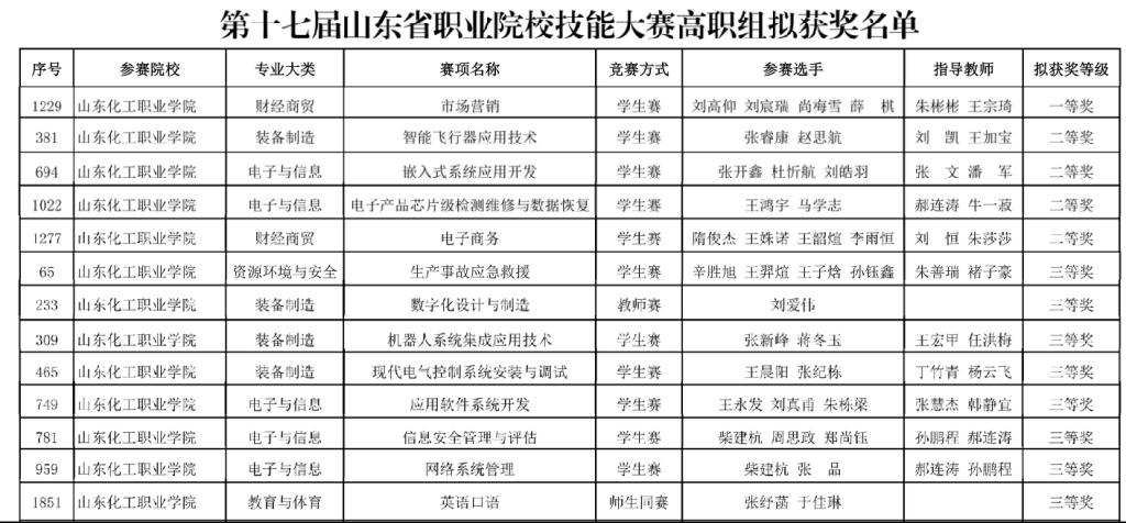 近日,山东省教育厅公布了《关于第十七届山东省职业院校技能大赛拟获奖名单公示》,我校共获奖13项,同比增长160%,其中一等奖1项,二等奖4项,三等奖8项,获奖数量和质量再创新高,实现大赛新突破。这些比赛成绩的取得既是学校师生优秀职业素养和职业能力的体现,也是对学校教学改革工作成效的充分肯定。