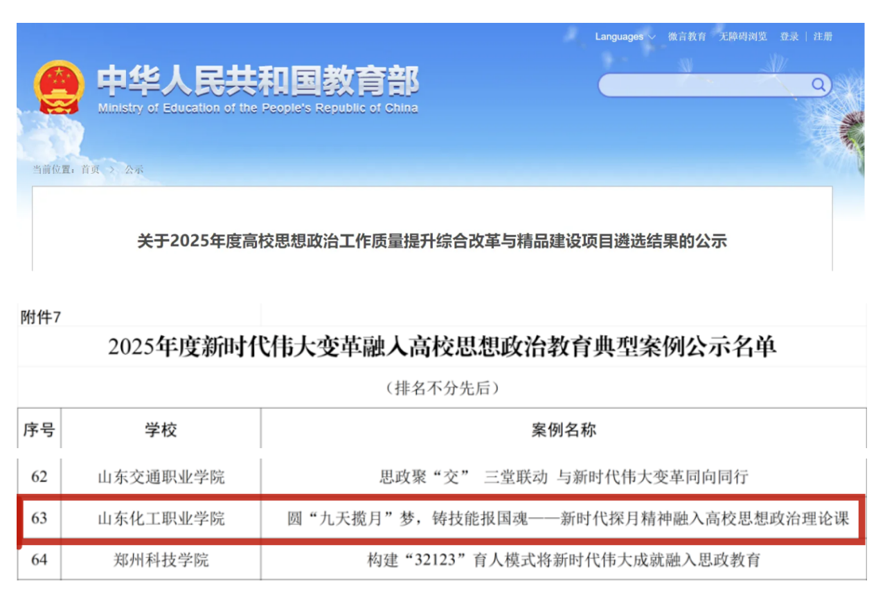 近日,教育部对2025年度高校思想政治工作质量提升综合改革与精品建设项目遴选结果进行公示,我校《圆“九天揽月”梦,铸技能报国魂--新时代探月精神融入高校思想政治理论课》入选教育部2025年度新时代伟大变革融入高校思想政治教育典型案例,标志着我校思政育人工作再结新硕果。