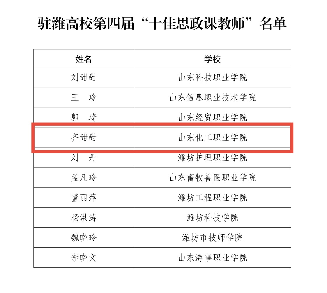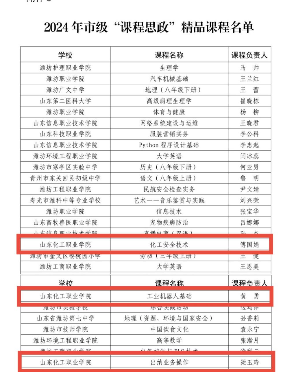 近日,中共潍坊市委教育工委公布了2024年潍坊市思政铸魂育人系列评选结果,我校在多个评选项目中入选。我校教师齐甜甜获评驻潍高校第四届“十佳思政课教师”,教师马瑞杰的《习近平新时代中国特色社会主义思想概论》课程获评市级思政课“金课”,教师傅国娟的《化工安全技术》、黄勇的《工业机器人基础》、梁玉玲的《出纳业务操作》等3门课程获评市级“课程思政”精品课程。