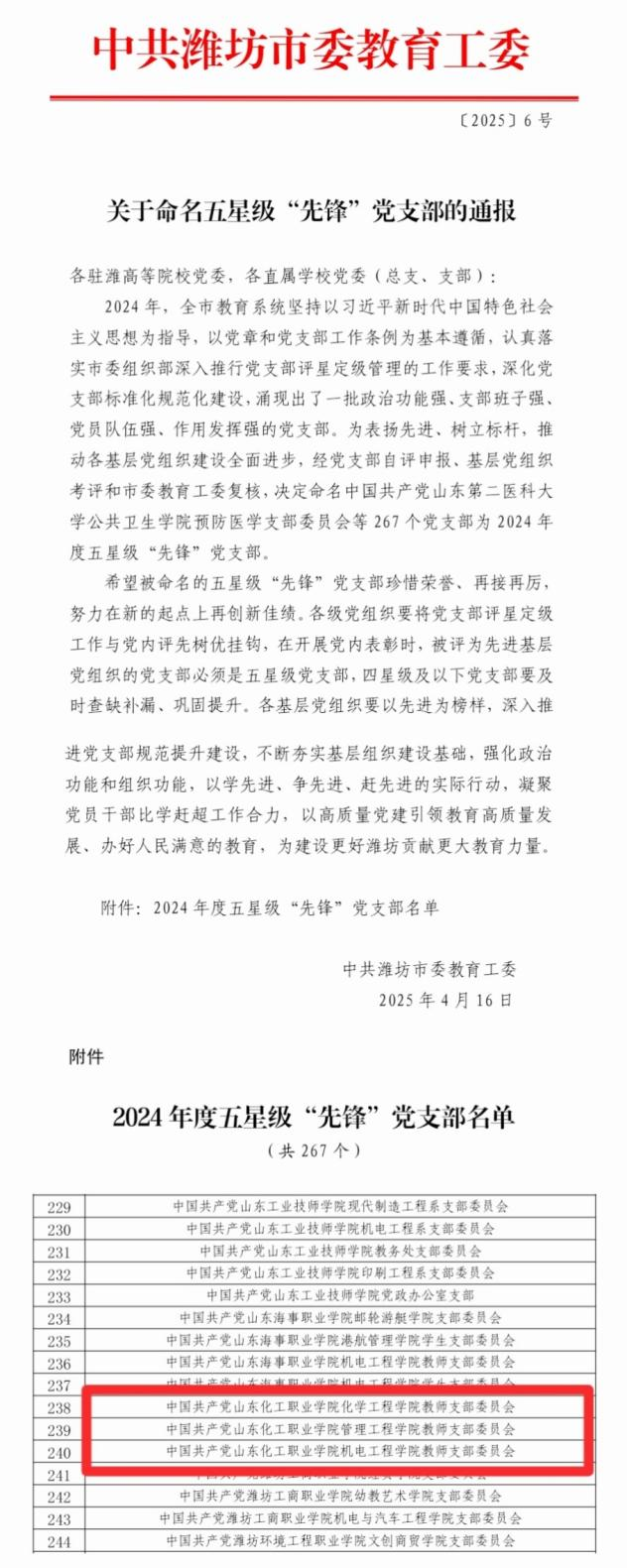 近日,潍坊市委教育工委发布《关于命名五星级“先锋”党支部的通报》,我校化学工程学院教师党支部、管理工程学院教师党支部、机电工程学院教师党支部三个支部被评为五星级“先锋”党支部。
