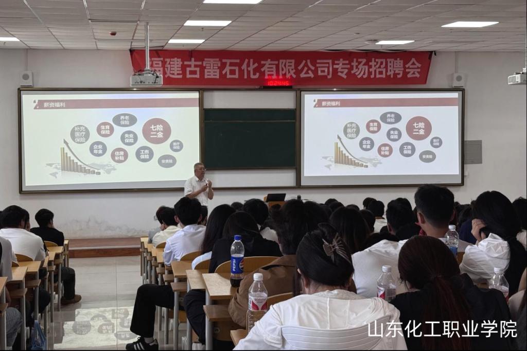 在福建古雷石化宣讲会现场,应冠羣介绍了古雷石化基本情况,针对同学们关注的职业发展与生活保障,就公司执行行业领先的薪酬体系、通勤班车、生活设施、文化活动等进行了解答,与同学们进行了互动交流。