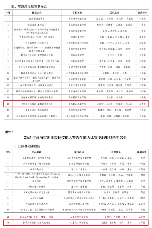 近日,潍坊市教育局对2025年潍坊市职业院校技能大赛教学能力比赛拟获奖名单进行公示。经过专家评选,我校共8个团队获奖,其中高职组一等奖团队1个、二等奖团队2个、三等奖团队4个,中职组三等奖团队1个。
