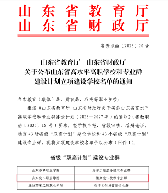 近日,山东省教育厅、山东省财政厅联合发布了《关于公布山东省高水平高职学校和专业群建设计划立项建设学校名单的通知》(鲁教职函〔2025〕20 号)。我校申报的精细化工技术专业群凭借扎实的建设基础、鲜明的产业特色和科学的发展规划,成功入选省级“双高计划”建设专业群。这标志着我校在服务区域产业升级、培育高技能人才方面迈入新阶段。
