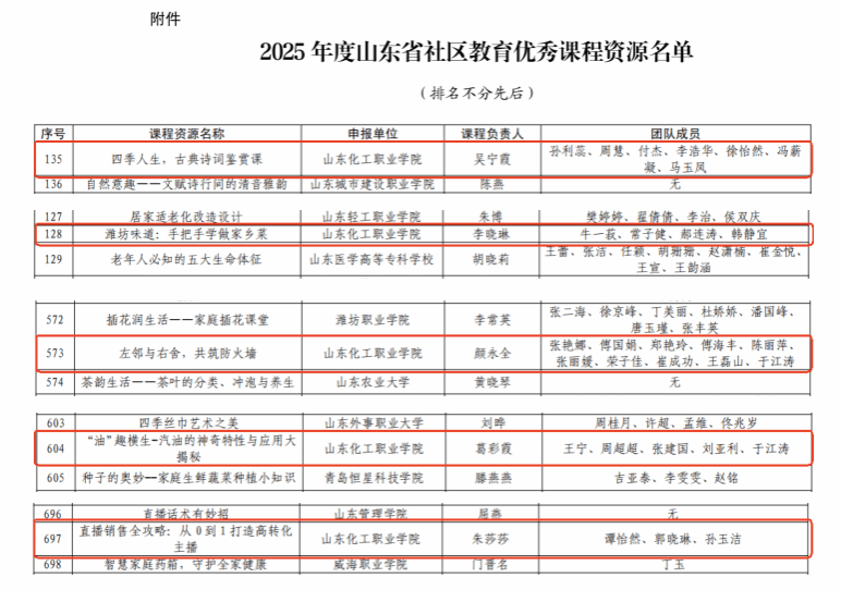 近日,山东省教育厅公布2025年度山东省社区教育优秀课程资源遴选结果。学院共有5门课程成功入选,分别是:《潍坊味道:手把手学做家乡菜》《四季人生,古典诗词鉴赏课》《左邻与右舍,共筑防火墙》《“油”趣横生-汽油的神奇特性与应用大揭秘》《直播销售全攻略:从 0 到 1 打造高转化主播》。