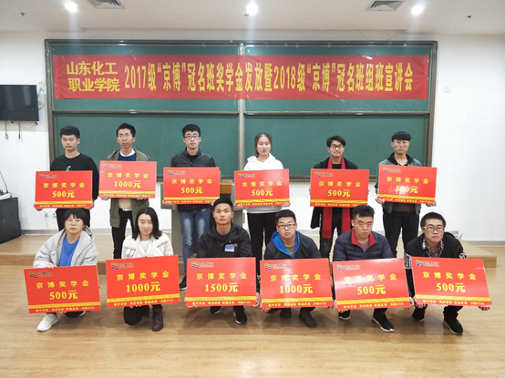 “京博”冠名班是学院跟山东京博石油化工有限公司合作共建的班级,在学校期间公司每学年以班级为单位为学生发放奖学金,公司优先选拔冠名班学生到京博集团实习和就业。