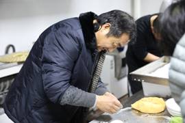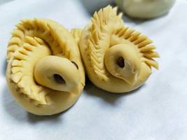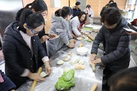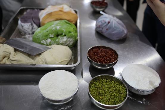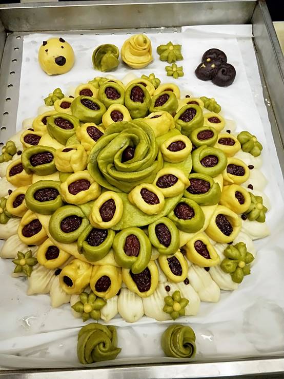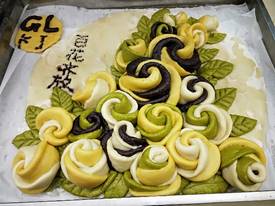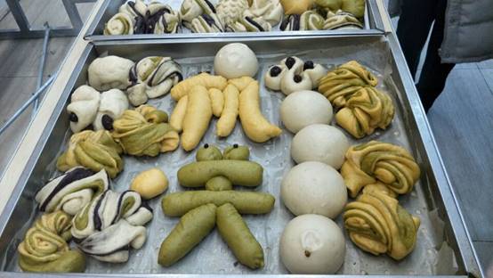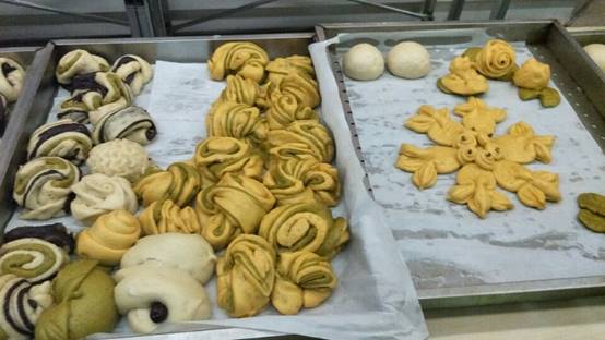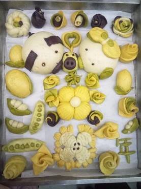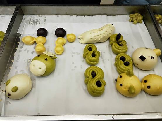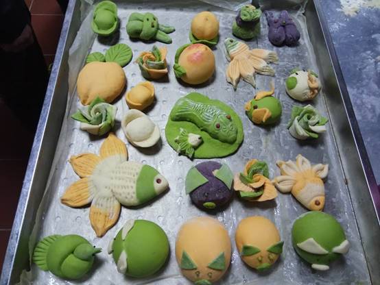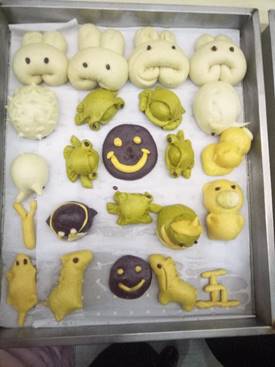 和面、揉面、切面、捏面,大家各司其职,有质有序。教书育人的老师们原来在厨艺上也是行家里手,一个个面团在心灵手巧的老师们手下变的乖巧无比,有的面团被搓成条,有的被揉成块,再辅以材料的点缀,短短时间里,一个面品就做成功了。大家发挥自己的奇思妙想,形态各异,有做成小动物的,有做成花卷的,有做成元宝的……,颜色也色彩不一,红、粉、绿、黄等颜色纷纷登场,炫耀着自己的身姿,展示着主人的手艺。