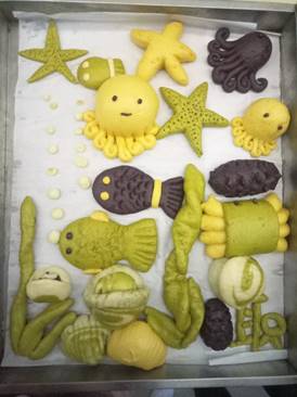 作品4:海底世界。“海纳百川,有容乃大。”宽广深邃的大海容纳着千百种生物,我们的面点制造了一个小小的海底世界,有鱼、海星、乌贼、贝壳、海参等生物。在这里感谢化院以大海般宽广胸怀包容我们每一位年轻教师和学生的同时,也希望学院的教学、科研以及管理等工作在新的一年能够像大海般更加有广度、有深度。