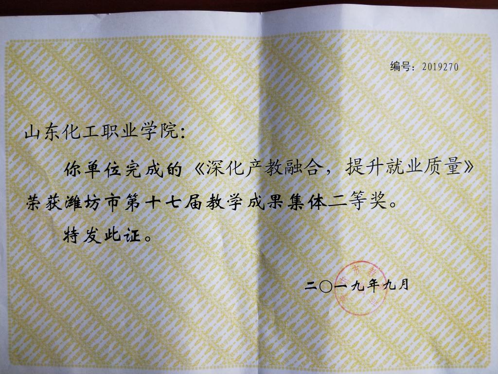 近日,潍坊市政府组织评审认定了第十七届市政府教学成果奖,山东化工职业学院的《深化产教融合,提升就业质量》获得教学成果集体二等奖。