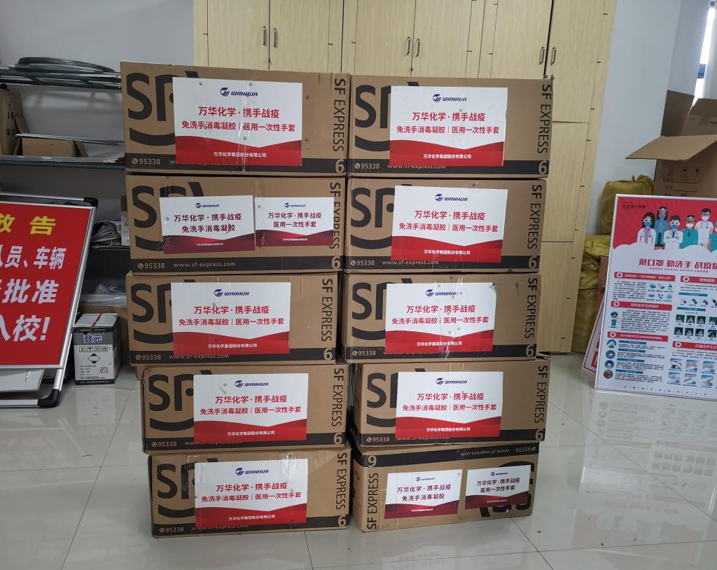 3月19日,万华化学集团股份有限公司向山东化工职业学院捐赠的300瓶免洗手消毒液、100盒PVC手套等防疫物资送达山东化工职业学院。在全民上下抗击疫情的关键时期,万华化学集团股份有限公司向山东化工职业学院捐赠防疫物资,将用于开学准备。山东化工职业学院将会把这批防疫物资进行妥善分配,用于校园疫情防控的第一线,确保企业的爱心之举发挥最大作用。