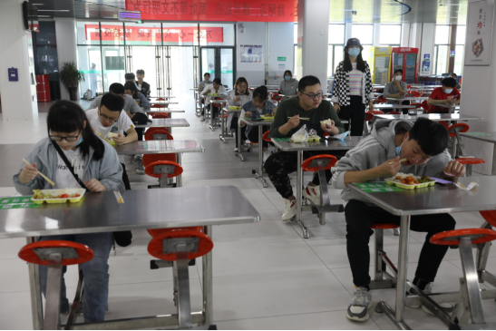 排队有序进入食堂,测体温,洗手,按序就坐,排队打饭。