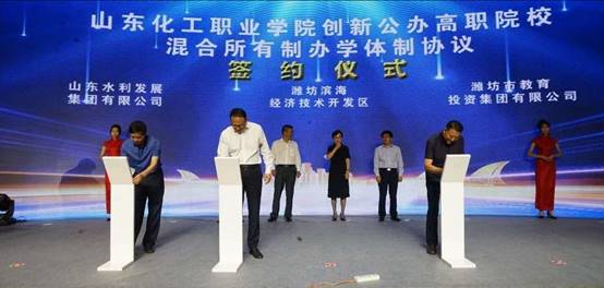 9月25日上午,潍坊市东方大酒店金色大厅,在部省共建国家职业教育创新发展高地工作推进会上,山东水利发展集团有限公司“牵手”山东化工职业学院,拉开了我省公办高职院校整建制混合所有制改革序幕。这也是大型国企参与公办高职院校整建制实施混合所有制改革的“破冰”之举。