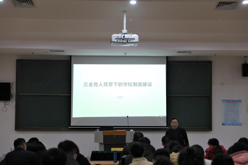 培训会第二部分由学院党委委员冯喜成以“三全育人背景下的学校制度建设“为题,从”教育的根本任务是立德树人“”创建三全育人型学校是实现教育根本任务的保障““建立规范透明的制度是实现三全育人的有效保障”等三个方面展开,他强调,立德树人不是一句口号,是教育的最终目的,要做到立德树人就要做到“三全育人”,即全员育人、全过程育人、全方位育人,党员干部在学院发展建设中应当主动担当作为,要进一步树牢“四个意识”、坚定“四个自信”、做到“两个维护”,落实立德树人的根本任务。