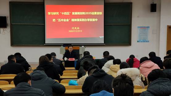 培训会分成两部分进行,第一部分由山东潍坊海洋科技大学园管理办公室党组书记、主任闫凤林以“学习研究‘十四五’发展规划和2035远景目标把‘五中全会’精神落实到办学发展中”为题,从“深刻认识十九届五中全会的重大意义,正确认识国际国内形势”“正确把握2035远景目标和‘十四五’重要目标、指导思想和原则以及重要任务”“坚持党的全面领导,深入贯彻落实五中全会精神,努力开创大学园建设新局面”等三个方面展开,他提出,要抓住机遇,振奋精神,开拓创新,扎实工作,努力实现职业教育的新跨越,为山东化工职业学院自身的发展和滨海区乃至潍坊市经济和社会发展做出更大的贡献。