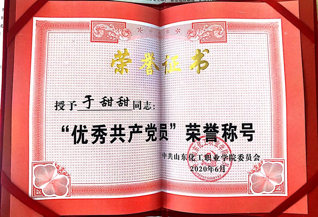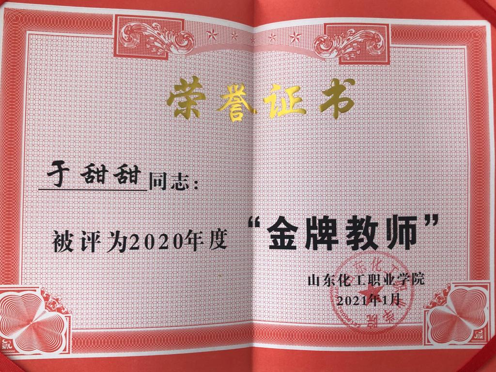 泰戈尔的诗中曾写道:“花的事业是甜蜜的,果的事业是珍贵的,让我干叶的事业吧,因为它总是谦逊地低垂着它的绿荫。”就是带着对绿叶精神的那份追求,和对教育事业的美好憧憬,2017年,于甜甜毕业后走进了山东化工职业学院的大门,成为一名思政教师,负责高职思想政治理论课的授课任务。对待教学,对待课堂,于甜甜无疑是认真的,热爱的。她深知思想政治理论的晦涩枯燥,一味地灌输理论,学生容易产生厌烦情绪,因此于甜甜采用生动诙谐的语言,引用生活化的案例,帮助学生理解理论知识,领悟思政学习的重要性,点燃学生对思政学习的热情和兴趣,提高学生们的思想政治素养。对教学的热爱,对专业的钻研,于甜甜荣获山东省首届学校思政课教学比赛二等奖,山东省第六届高校教师教学比赛三等奖,2020年度驻潍高校“十佳思政课教师”称号,连续3年获得校级“优秀教师”,获得“优秀共产党员”等荣誉称号。