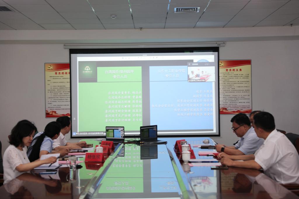 7月6日下午,山东化工职业学院与国亨化学有限公司就开展校企合作等相关事宜召开了山东潍坊、台湾台北、福建泉州两岸三地视频会议。山东化工职业学院校长王敬良、副校长冯喜成,校企合作处、化学工程学院、机电工程学院等部门负责人,台湾国乔石油化学股份有限公司董事长、泉州国亨化学有限公司法定代表人杨品正、泉州国亨化学有限公司总经理张聪明等七人参加了视频交流会。冯喜成副校长主持本次会议。