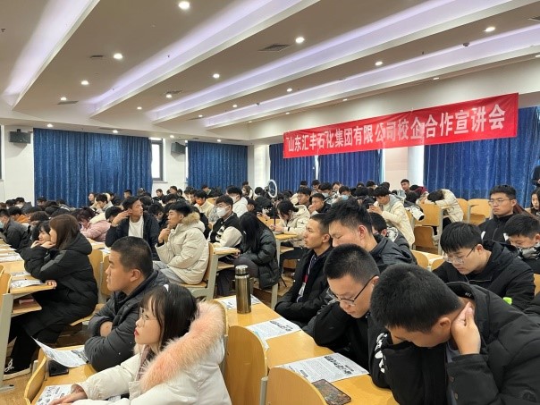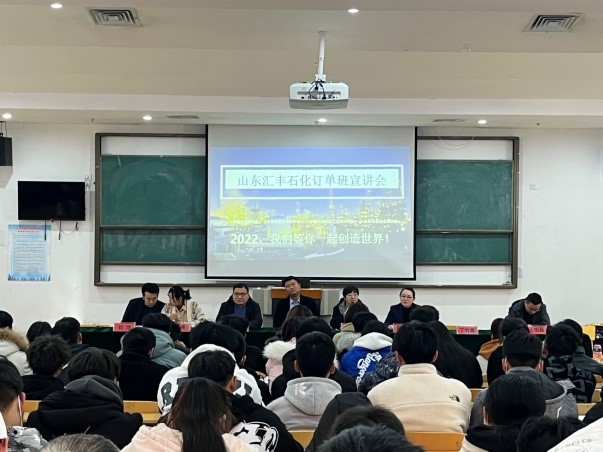 宣讲开始,教务科研处丁处长与校企合作处王处长就校企共育项目的发展予以充分肯定,明确了专业人才链与产业链密切对接的重要性,也期望我院与山东汇丰石化联手共建校企命运共同体。随后,汇丰石化人力资源部于经理就企业概况进行了简介,也回顾了我院多年来与汇丰石化校企合作发展的历程,从技能提升、就业保障等方面表达了对订单班学生未来发展的肯定,并表示期待优秀学生加入汇丰石化。
