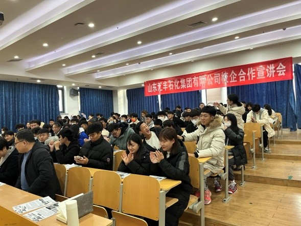最后,汇丰石化人力资源部主管崔曦就汇丰石化订单班进行了详细的讲解,从企业实景、地理位置到企业文化发展再到公司以人为本的理念进行了全方面的介绍,同时也解答了学生们对员工薪资待遇以及晋升发展等问题的疑问。宣讲会现场气氛活跃,许多在场同学表达了对汇丰石化订单班的意向。