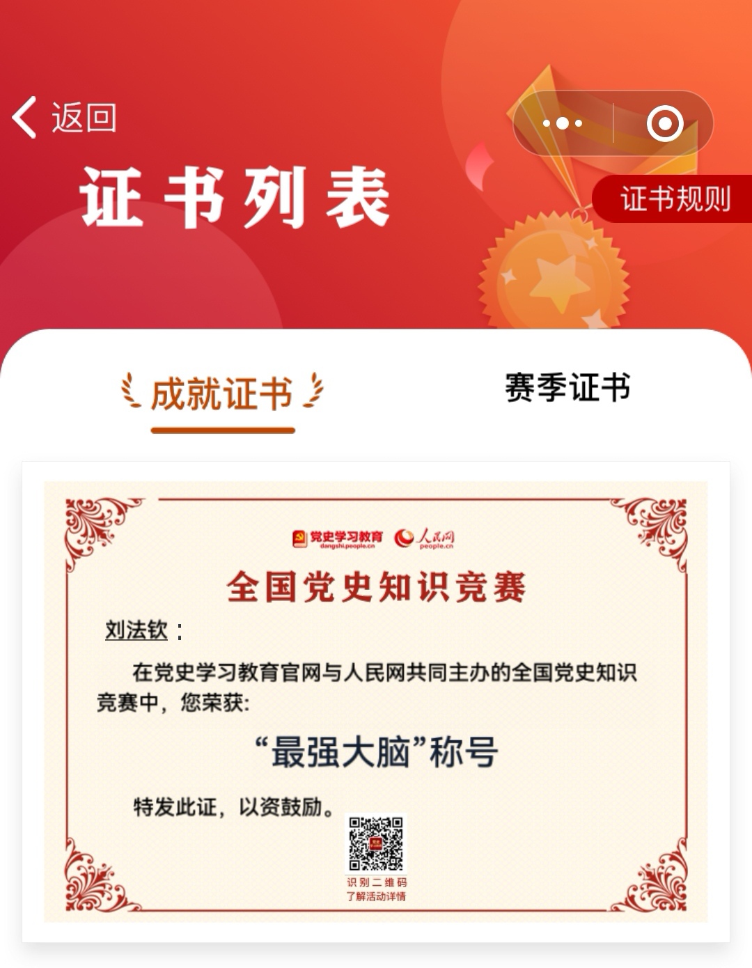兴趣是学习最好的动力。谈到自己在“学习强国”上取得的优异成绩,刘老师首先归功于自己对于历史等人文社科的浓厚学习兴趣。“学习强国”上的理论、党史、文化、文艺、科学、法治知识为刘老师提供了丰富的学习资源,借助平台上丰富的学习资源和竞赛答题,丰富学习模式,提高了学习兴趣,更加热衷于学习,学习成绩自然名列前茅。2020年11月11日,刘老师在“学习强国”挑战答题创下1600道题全通关的记录。在党史学习教育网和人民网今年主办的党史学习教育知识竞赛中,刘法钦老师坚持学习和答题,成绩优异,荣获“最强大脑”、“百胜将军”“勤学不倦”和“知识达人”等称号。