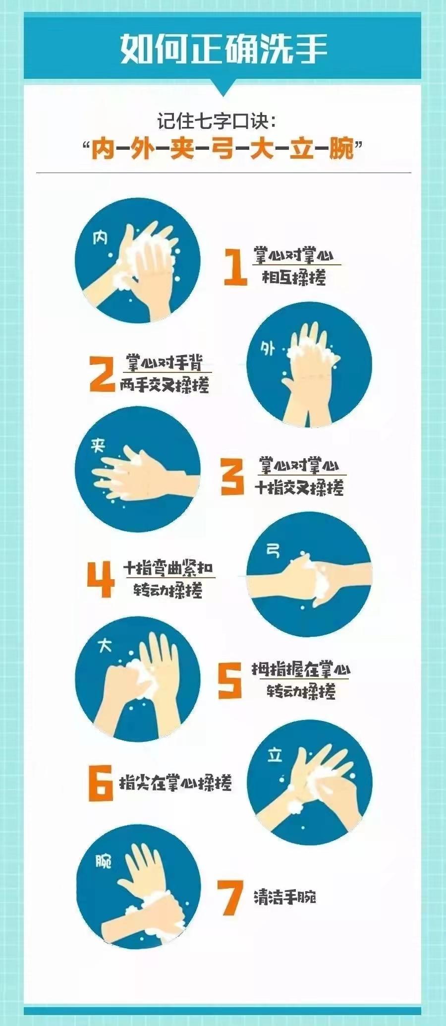 新冠病毒感染性极强,传播途径、方式多样,若手部感染病毒,再用手接触眼睛、鼻子、嘴等部位,均会导致感染。勤洗手、保持手部清洁可有效预防感染。按照七步洗手法(内、外、夹、弓、大、立、腕),使用流动水、肥皂或洗手液洗手,可有效杀灭新冠病毒。外出回来、饭前便后、咳嗽或打喷嚏后,需要及时洗手。