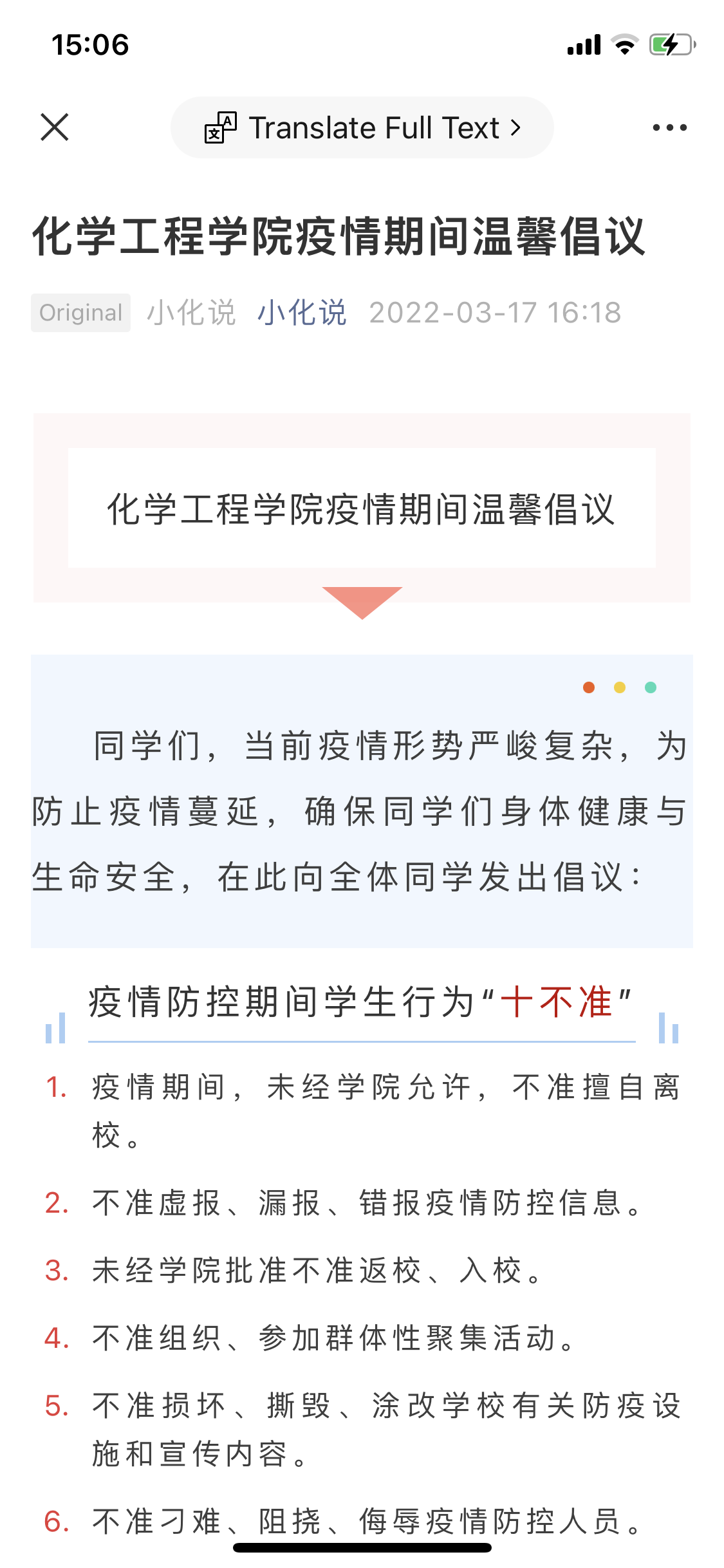 安全保卫处和后勤服务中心在校园里组织消杀、发放防疫物资,组织核酸检测、上报防疫信息等,筑牢学校的抗疫“防火墙”。营造安全健康的校园环境。化学工程学院通过小化说公众号及楼层宣传,发布防疫温馨倡议,编制防疫顺口溜,宣传防疫知识。