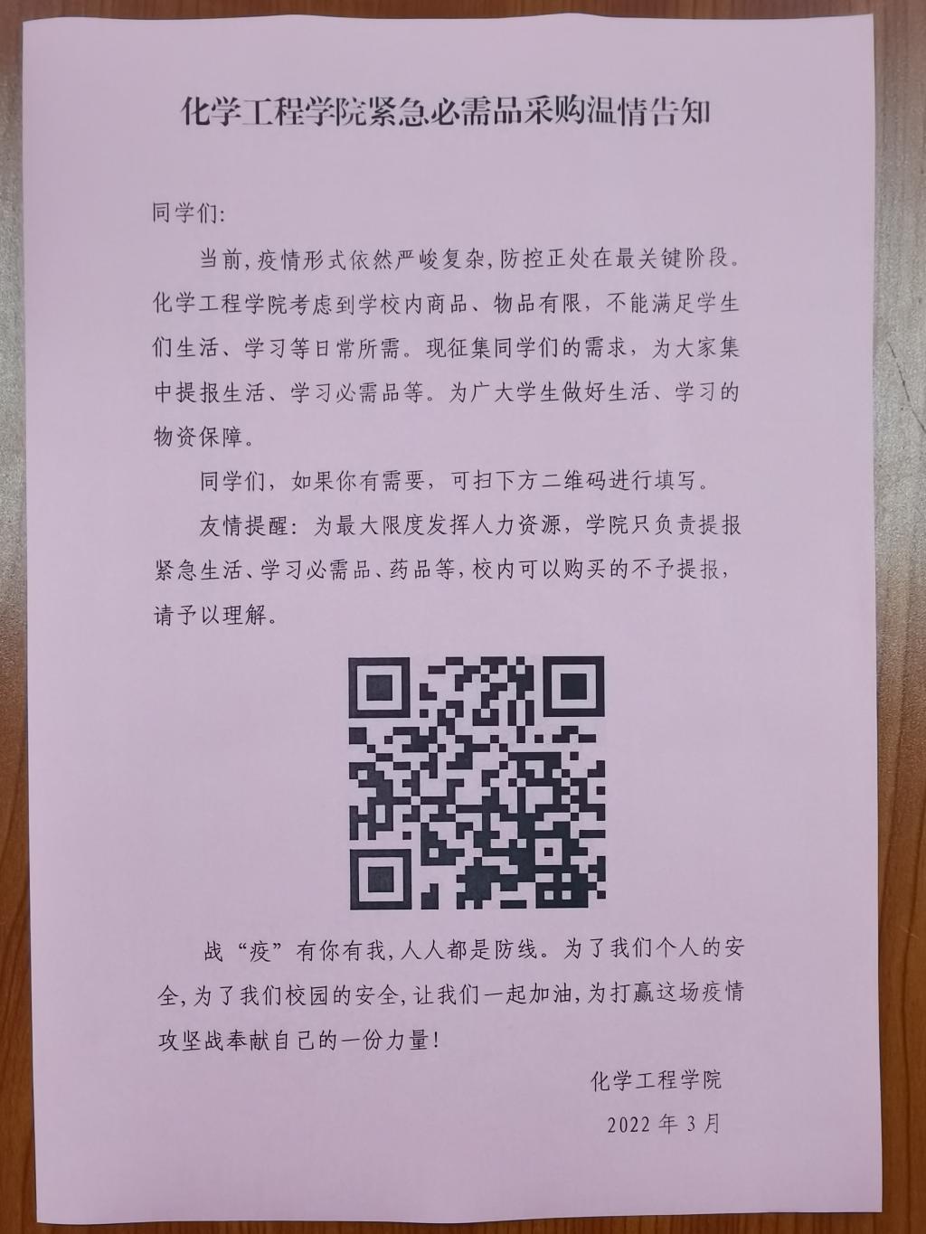 疫情期间,后勤服务中心第一时间保证在校师生的生活物资供应和食品卫生安全;化学工程学院发布紧急物品采购告知书,并制作小程序收集学生紧急物品需求,解决全体师生生活上的后顾之忧,让老师和学生们的在校生活安心放心。