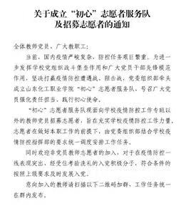 党委组织部号召成立的“初心”志愿服务队,受到了全体教职工的积极响应,123名教职工加入到了疫情防控志愿服务的队伍。青年学生们也加入到了志愿服务中,校门口、校园里、教学楼、宿舍楼,每一个需要的地方,都有他们的身影。校园之外,也有化院学子的影子,不少在校外实习实训的学生也投身到防疫第一线,为社区的疫情防控服务,为学校捐赠抗疫物资,彰显责任与担当。