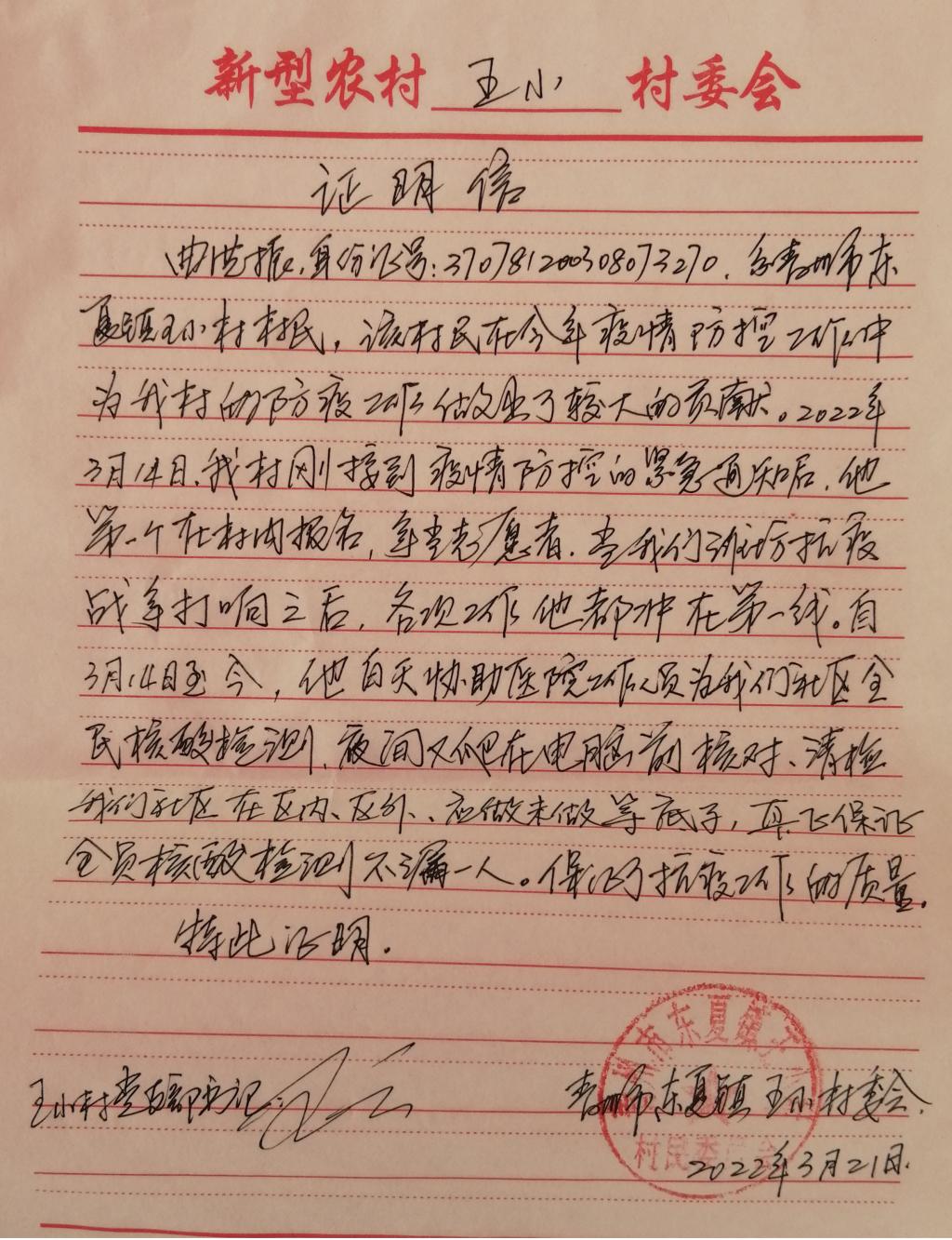 3月21日早上7:00,青州市东夏镇王小安置小区的疫情防控值班室里,一个忙碌的身影正在打印核酸检测登记表,一边打印表格一边接电话,“好的,表格马上就打印好了,我这就去通知所有村民。”放下电话,他便马不停蹄的带上喊话器跟其他工作人员一起往小区里面跑,边跑边喊“八点开始做核酸,大家带好身份证提前排队。”随着村民们陆续开始排队,他已经坐在了核酸检测工作台前做好了准备工作,登记身份信息、试管贴码,每一个环节他都熟练而又迅速,在他的配合下,小区1800余人的核酸检测不到五个小时就全部完成了。
