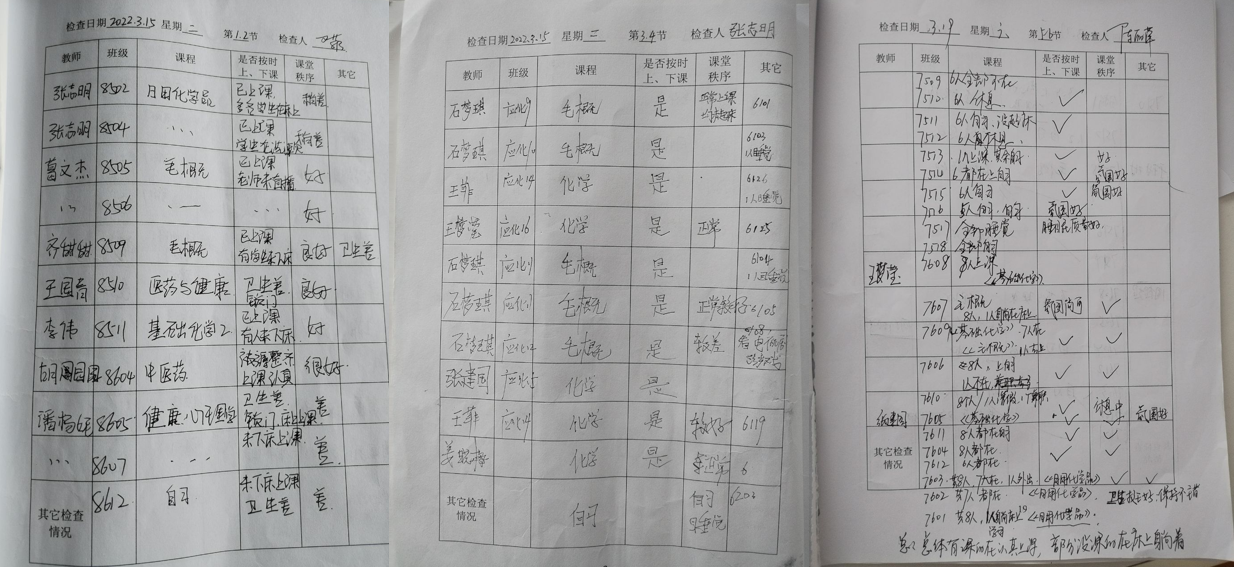 学院根据教师的授课空闲时间以及学生宿舍的分布情况,全体教师主动报名参加教学巡查,学院对巡查工作提出相关要求,明确教学巡查职责:1.查看学生人数;2.管理上课纪律;3.排查安全隐患;4.倾听学生诉求;5.指导宿舍卫生;6.巡查教师上课。