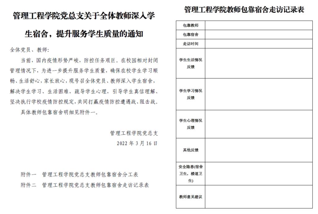 教学细节处处透着暖心,学生思想引导更不容忽视。在校园相对封闭管理情况下,管理工程学院严格落实学校要求,组织全体党员及教师包靠全院234个学生宿舍,深入了解学生思想、学习和生活动态,确保在校学生学习顺畅、生活舒心。