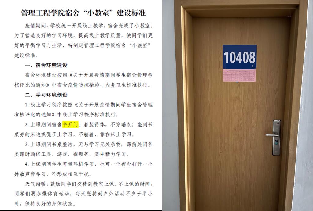 为了让同学们更好的提高宿舍上课质量,管理工程学院先后制定了“线上授课宿舍指导计划表”,无课教师深入宿舍开展线下指导;制定并发布了管理工程学院宿舍“小教室”建设标准,营造良好的学习环境;把课表贴在门上,使同学们在同一空间里更好的平衡学习与生活。