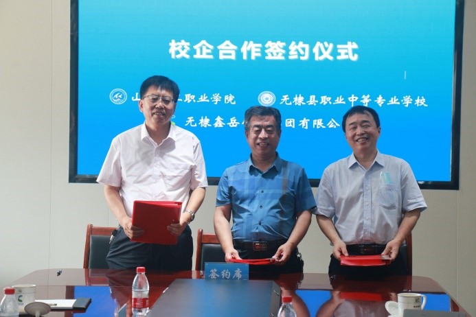 6月23日上午,学校与无棣县职业中等专业学校、鑫岳化工集团有限公司校企合作协议签约在鑫岳化工集团有限公司顺利举行。在两校一企参会人员的见证下,副校长冯喜成与无棣县职业中等专业学校校长冯汝光、鑫岳化工集团有限公司董事、董事会秘书孔令泉共同签署校企合作协议书,并与无棣中专、鑫岳化工负责人深入交流。学校校企合作处副处长王超、教务科研处副处长丁竹青参加了签约仪式。