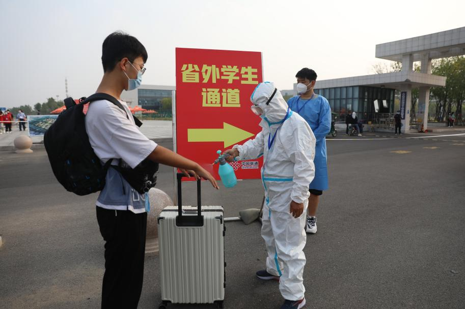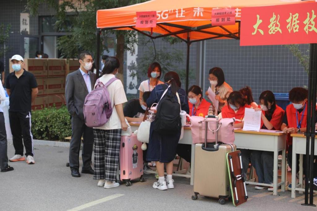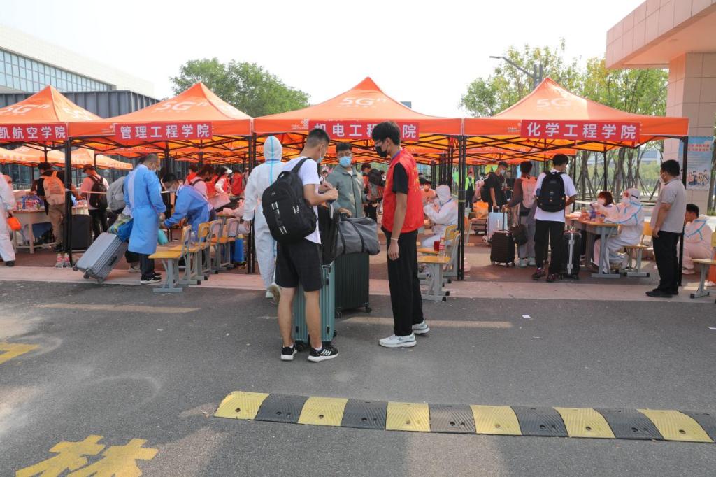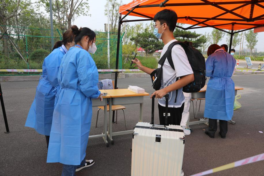 行李消杀,测量体温,查看行程码、健康码,入校核酸检测,迎接萌新,疫情防控不能丢。学校不仅有饱满的热情,更有到位的防疫安全防护措施,井然有序,层层把关,筑牢校园防疫线。