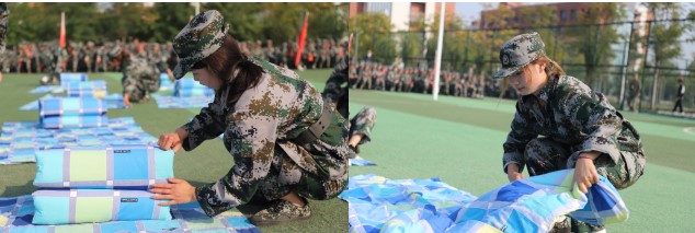 紧接着进行内务整理展示,学生熟练地运用“压、折、挤、掏”等基本动作,快速完成了从棉被到“豆腐块”的升华,展示了日常训练水平。