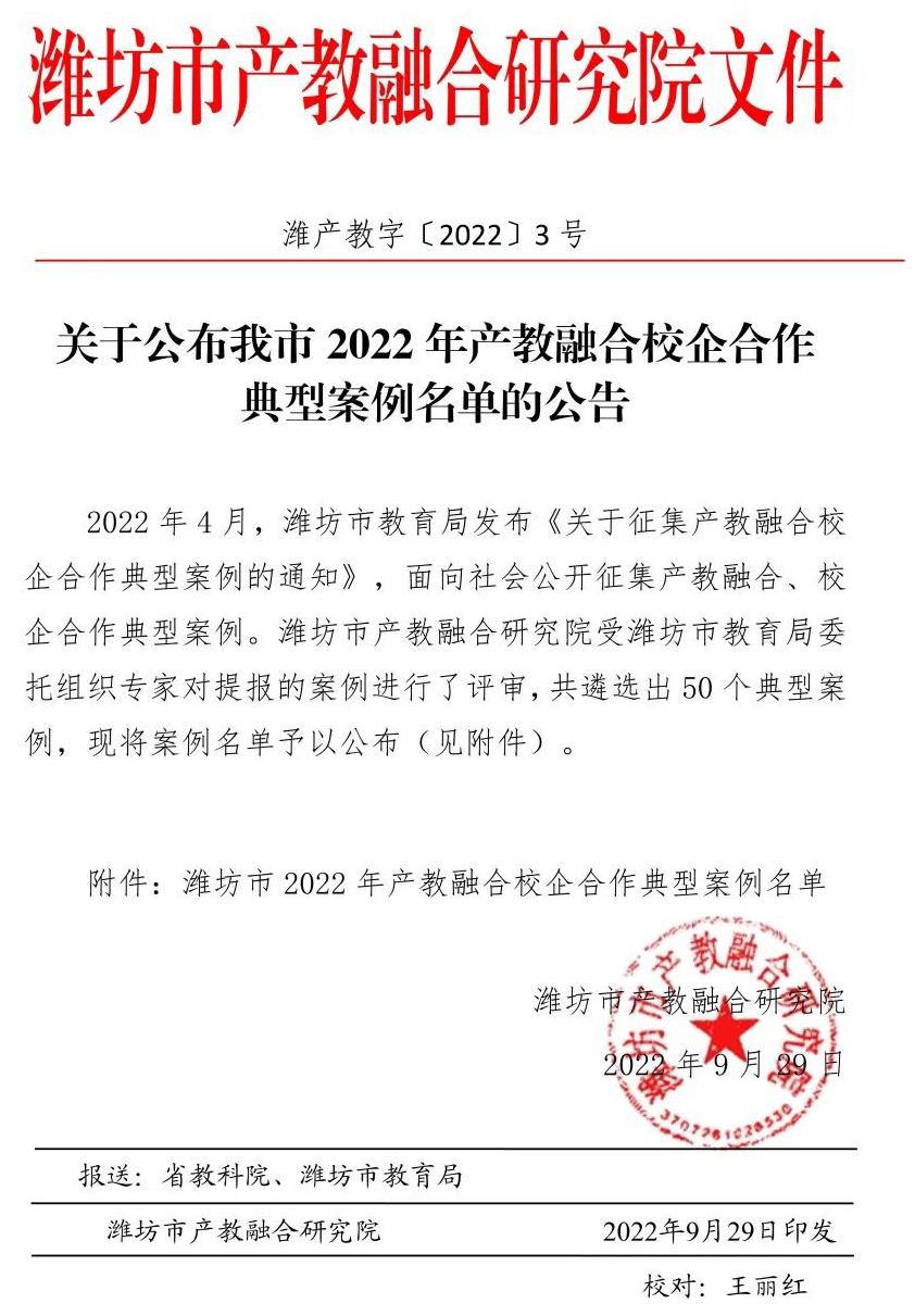 2022年4月,潍坊市教育局印发《关于征集产教融合校企合作典型案例的通知》,面向社会公开征集产教融合、校企合作典型案例。潍坊市产教融合研究院受潍坊市教育局委托组织评审专家对提报的案例进行了严格认真的审评,共遴选出50项典型案例,我校《高职院校机电一体化技术专业“双主体三融合”实践教学模式》《“五即”理念:促校企融创,助人才培养》《软件技术专业联手歌尔工学院打造“匠心班”培育“大国工匠”服务地方产业》共3项典型案例入选潍坊市2022年产教融合校企合作典型案例。