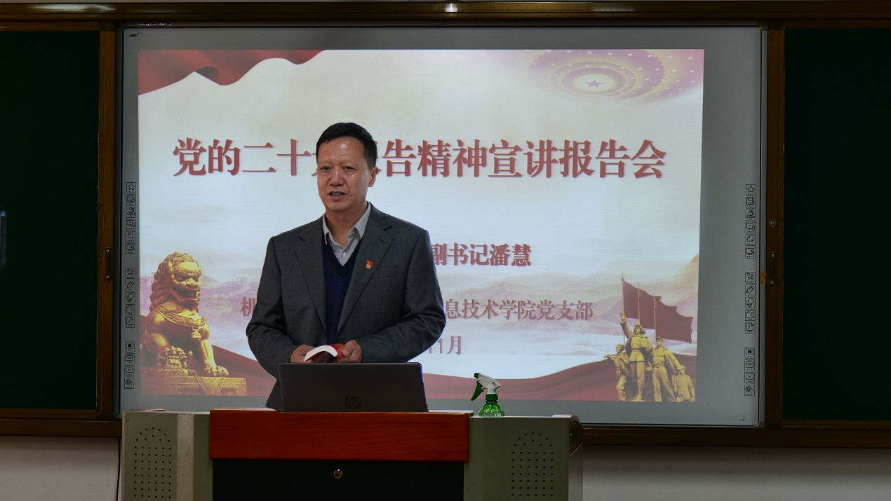 为了帮助机电工程学院和信息技术学院的师生更好地学习领会党的二十大会议精神,2022年11月25日下午,机电工程学院党总支和信息技术学院党支部联合组织举办党的二十大精神宣讲报告会,邀请学校党委副书记、党的二十大精神宣讲团成员潘慧同志为两个学院的教师党员、学生党员和全体教师宣讲党的二十大精神。此次报告会通过线上和线下相结合的方式进行,在校的老师现场听讲,校外的老师和实习的学生党员通过线上的方式参加。