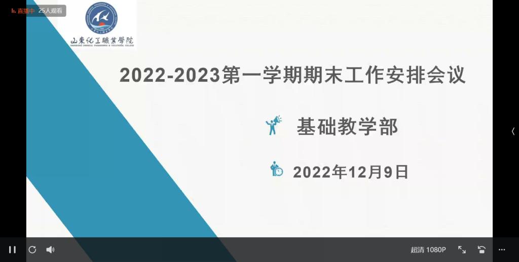 2022年12月9日,为确保学期末各项工作顺利进行,圆满完成学期末各项教学工作任务,基础教学部召开了2022-2023学年第一学期期末工作安排线上会议。本次会议由基础教学部副主任吴宁霞主持,全体教师参加会议。