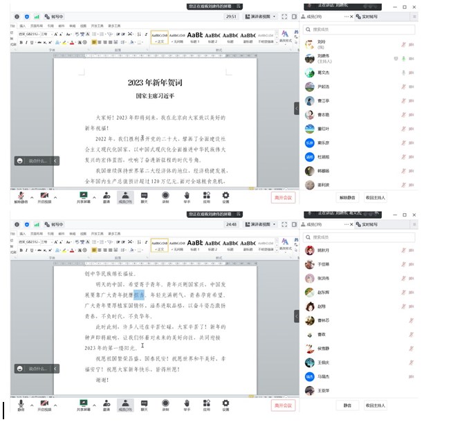 首先,与会人员集体学习了国家主席习近平2023年新年贺词。习近平主席的新年贺词,让全国人民倍感亲切和振奋。一句“每个人都不容易”,共情民生冷暖;一声“让明天的中国更美好”,激扬奋进豪情。通过学习,广大教师深刻认识到,在刚刚过去的2022年里,面对道道关隘、面临重重考验,党带领全国人民团结奋斗,铸就坚强盔甲,各项事业取得的成绩来之不易。面对新征程,任凭风云变幻、风高浪急,只要全党全国各族人民在党的旗帜下团结成“一块坚硬的钢铁”,以愚公移山的志气、滴水穿石的毅力,脚踏实地,埋头苦干,就一定能够把宏伟目标变为美好现实。