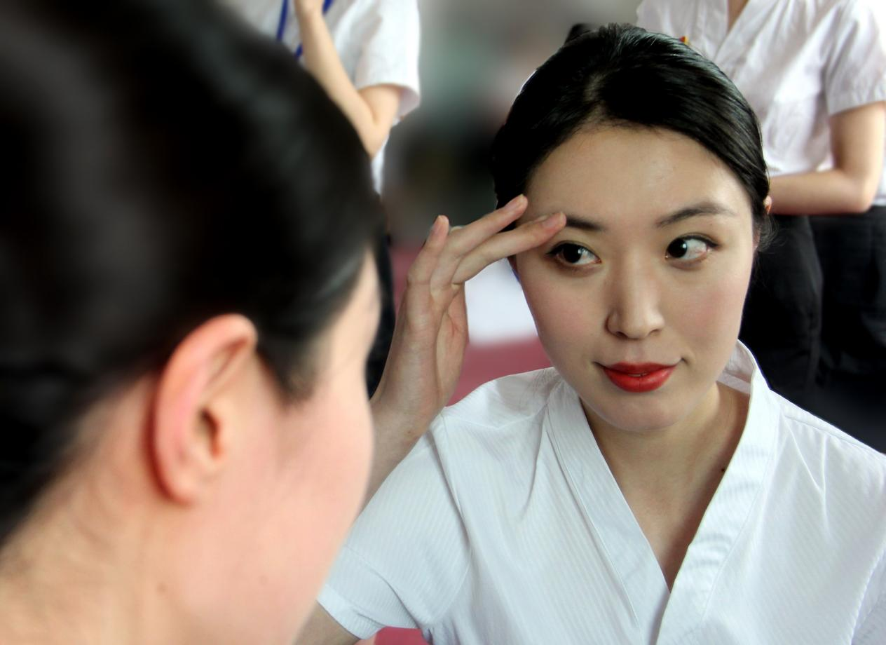 图为面试前再次照镜精心整理仪容的面试者