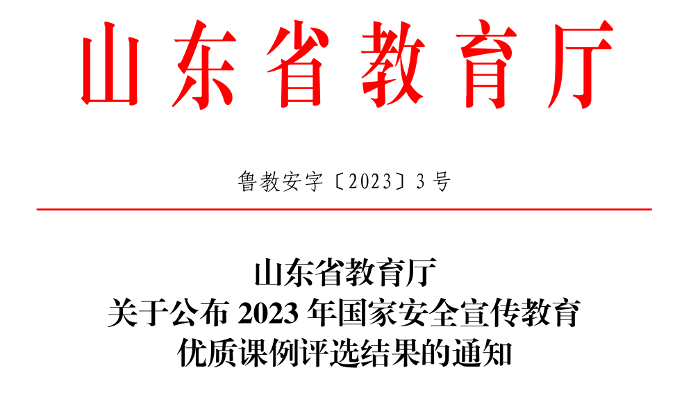 2023年8月2日,山东省教育厅发布了《关于公布2023年国家安全宣传教育优质课例评选结果的通知》,我校黄勇、刘凯老师提报的作品《边境安全-你我共护》获得一等奖,刘晓洁、任洪梅老师提报的《文化安全,从我做起》作品获得二等奖。