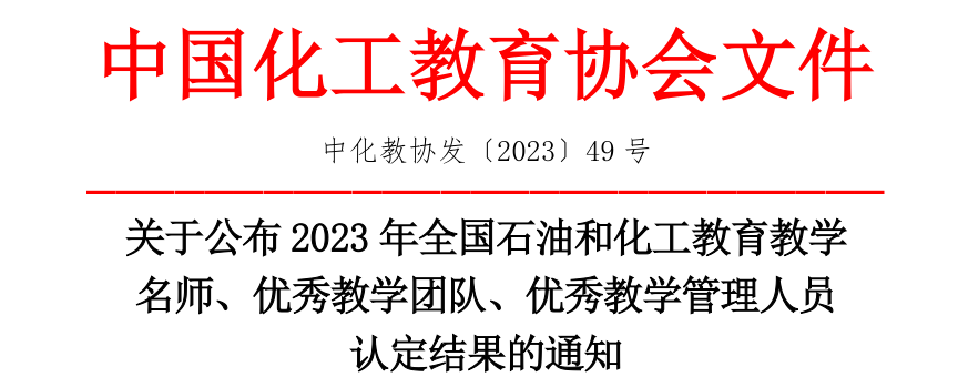 10月12日,中国化工教育协会发布《关于公布2023年全国石油和化工教育教学名师、优秀教学团队、优秀教学管理人员认定结果的通知》(中化教协发〔2023〕49 号),我校应用化工技术专业教学团队获批全国石油和化工教育优秀教学团队。