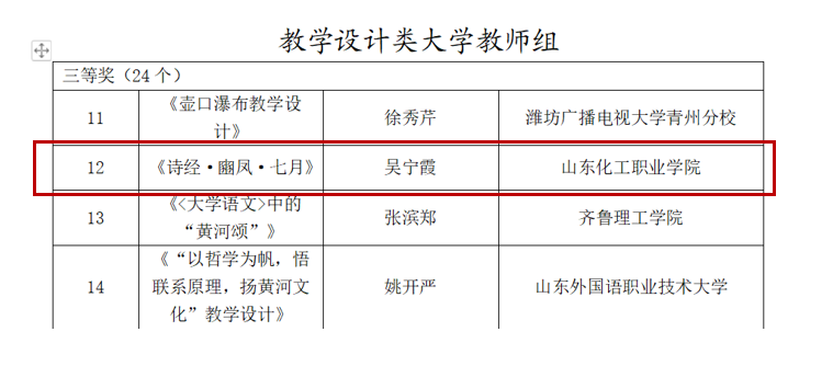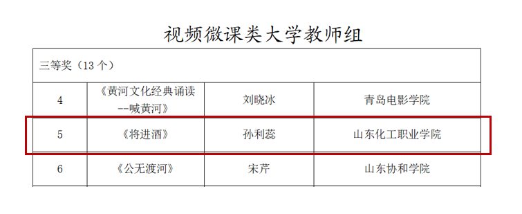 近日,山东省教育厅山东省语言文字工作委员会公布了黄河文化经典诵读课例评选大赛的比赛结果,基础教研部周蕙老师的《将进酒》、吴宁霞老师的《诗经·豳凤·七月》分别获得了教学设计类大学教师组一等奖和三等奖,孙利蕊老师的《将进酒》获得视频微课类大学教师组三等奖。