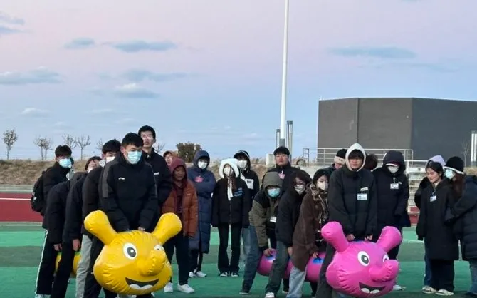 最后一个项目“趣味毛毛虫”,学生干部提着毛毛虫上场,滑稽又可爱。他们从刚开始的寸步难行到后来的步伐一致,努力冲向终点,这一刻他们成为了一个整体,成为了一只奋力向前奔跑的“毛毛虫”。