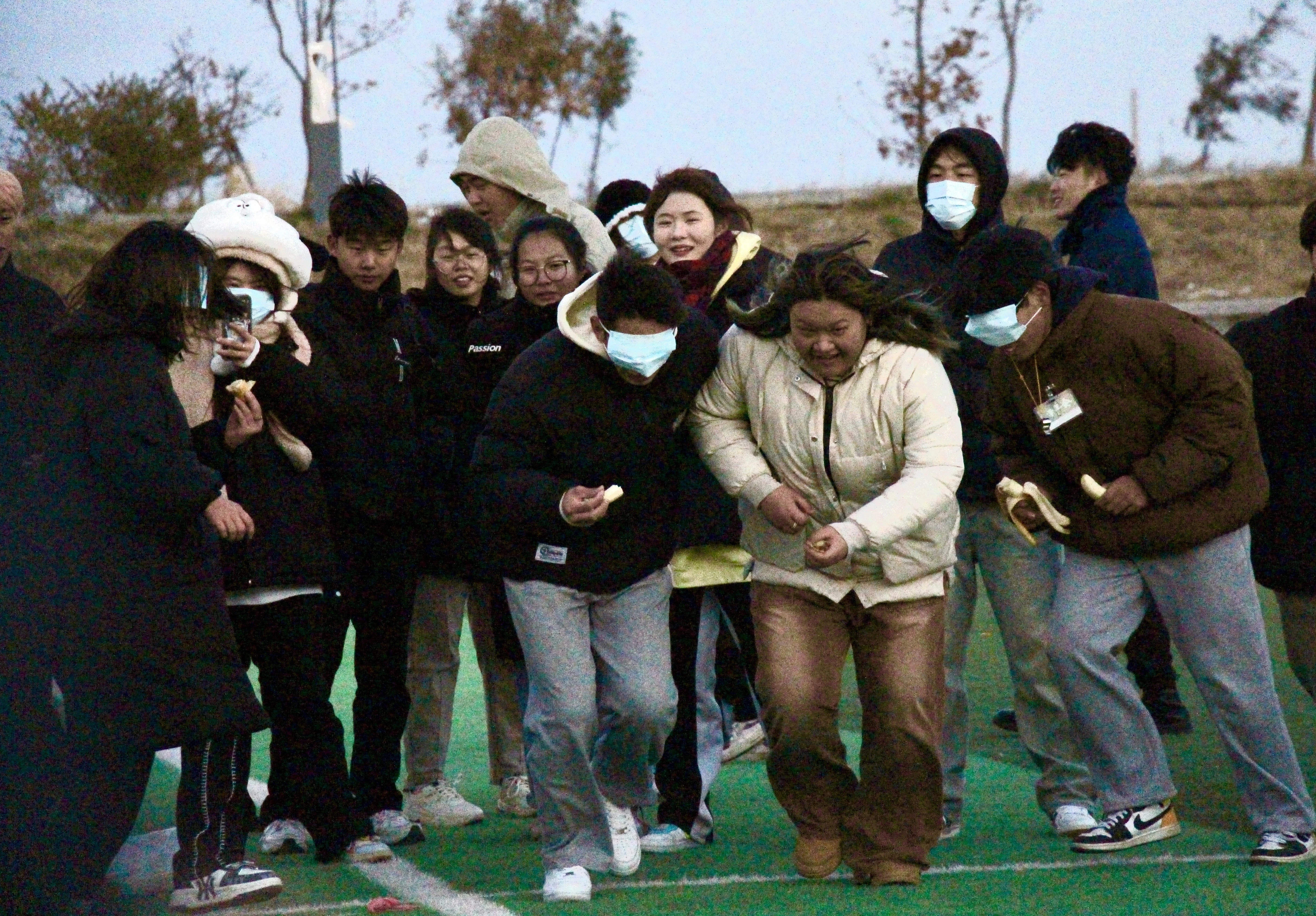 在学生的加油呐喊声中,“蒙眼喂香蕉”这个最令人期待的比赛开始了。比赛中师生相互信任,配合默契,增进了师生之间的沟通与交流。